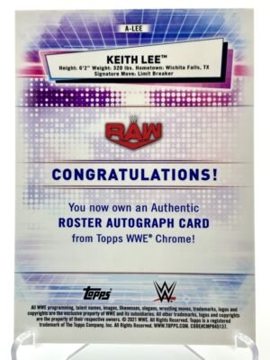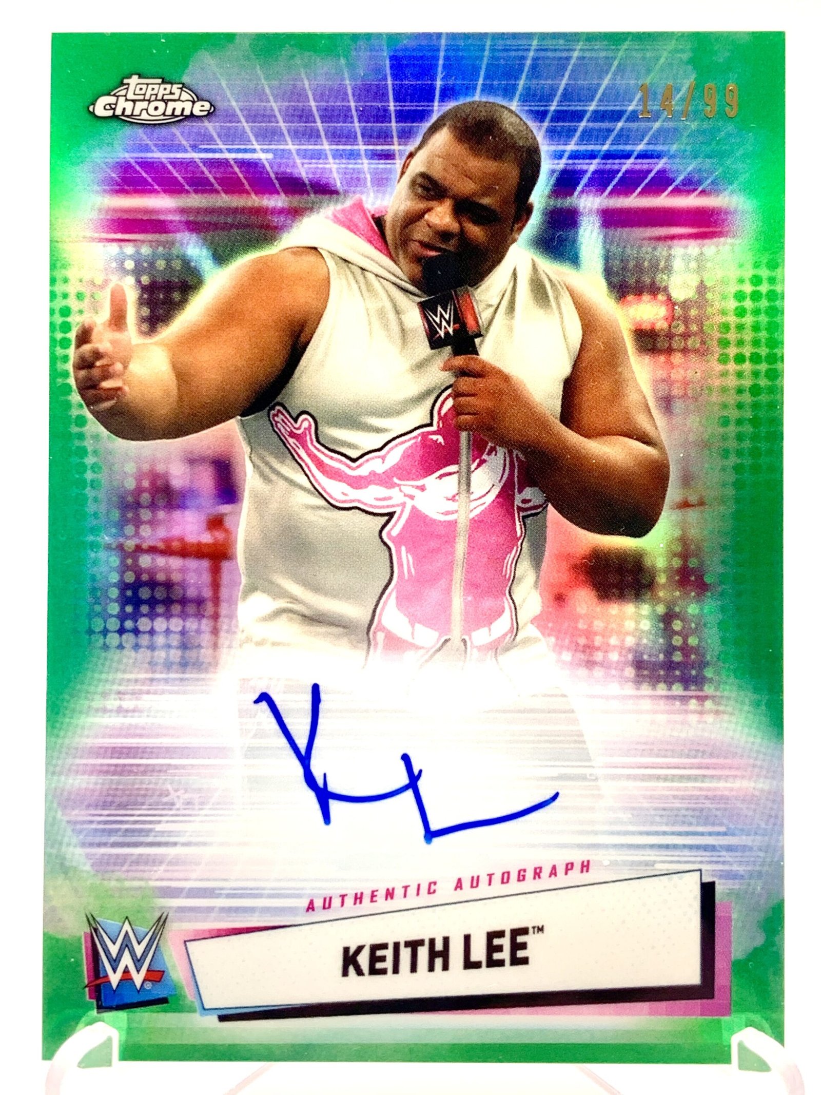 The 2021 Topps Chrome – Keith Lee Green Refractor Auto is a must-have for avid WWE enthusiasts and trading card collectors alike. Celebrating one of the most captivating performers in modern wrestling, Keith Lee, this card captures the thrill of his career in a stunning green refractor finish. With its exclusive 14/99 serial numbering, this collectible offers both rarity and value, making it a remarkable addition to any collection.